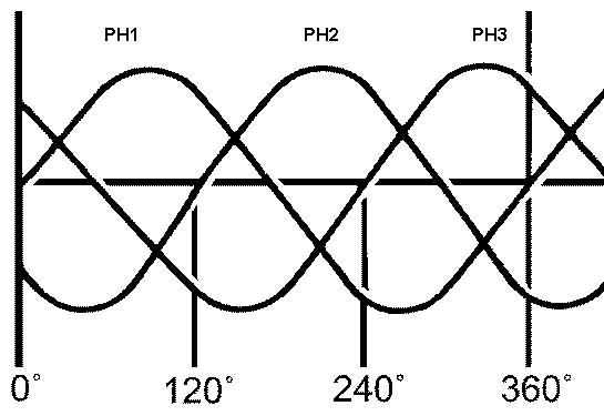Three phase electricity is usually found in factories and other industrial buildings where high power is required. 3 or four wires are used to transfer the power to the buildings. 3 Wires for the three phases and one wire for neutral. Neutral is not always present. The three phases are offset by 120 Degrees as shown on the drawing below: